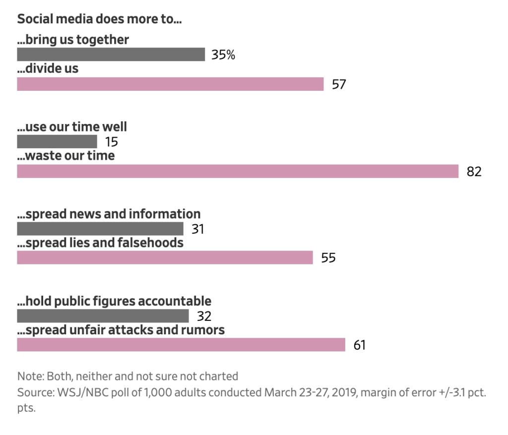 1. People are growing sour on social media, even if it is difficult to break the addiction. The Wall Street Journal/NBC News poll of American behaviors finds adults see platforms like Facebook and Twitter as divisive and generally a waste of time, despite the fact that they visit these sites regularly. No wonder that a new study published in the Canadian Journal of Psychiatry based on observations of more than 3,000 seventh to 10th graders in the greater Montreal area over a period of four years found that social media use and screen time can lead to an increase in depression and anxiety among teens.
